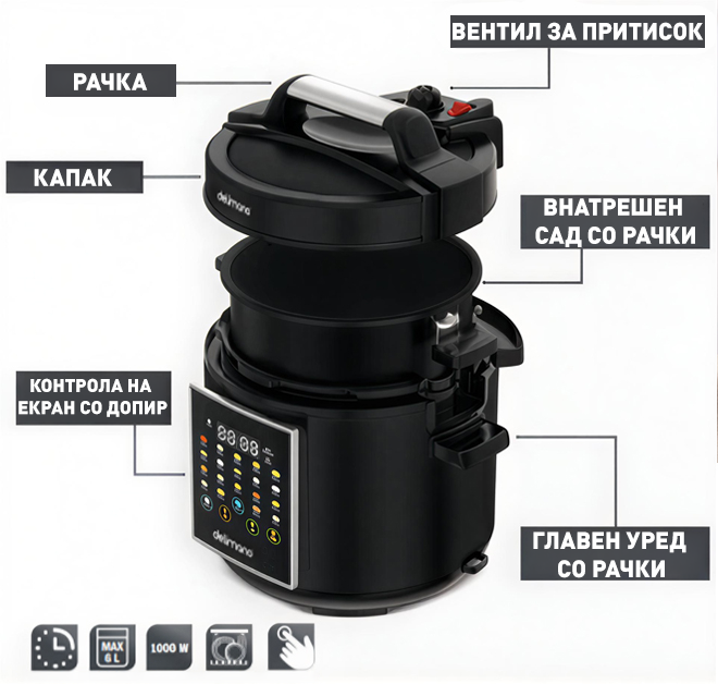 Multicookeri i ri elektrik me presion Delimano Pro 6L e bën gatimin e përditshëm më të shpejtë, më të lehtë dhe më të gjithanshëm. Me 19 programe të paracaktuara, ekran modern me prekje dhe kapacitet të madh për familje, ai zëvendëson disa pajisje kuzhine në një pajisje kompakte. Gatuani ushqime të shijshme deri në 70% më shpejt, duke shijuar komoditet, siguri dhe rezultate të qëndrueshme.